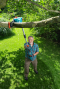 Bekväm beskärning av grenar högt upp i träden, säkert stående på marken